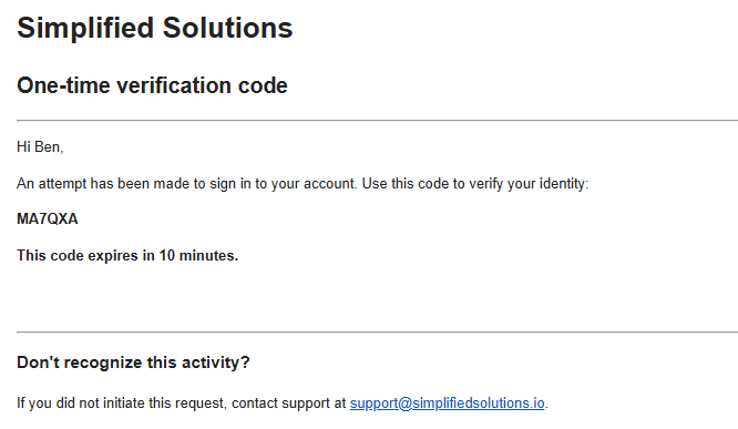 Once registration is complete, Simplified Solutions sends a verification email to the address you provided. This email contains a short verification code.