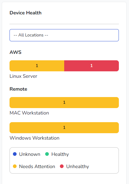 On the Dashboard, this section appears as Device Health and summarizes device status by location and device type using simple, color-coded charts.
