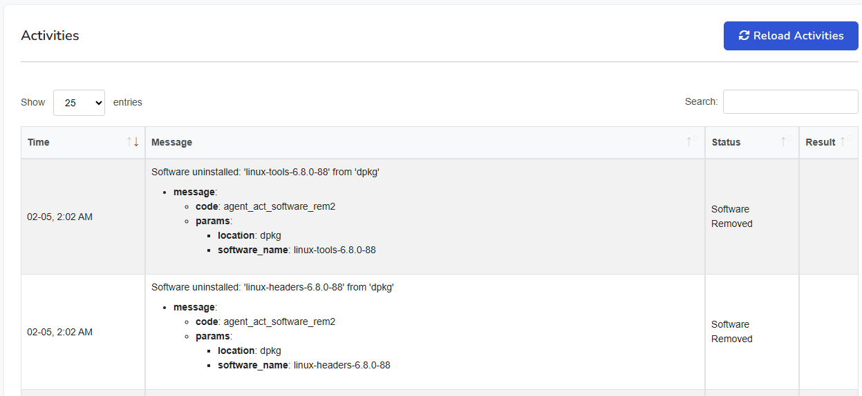 The Activities section provides a chronological log of actions performed on or by the device. This includes software updates, patch installations, scans, and other automated tasks.
